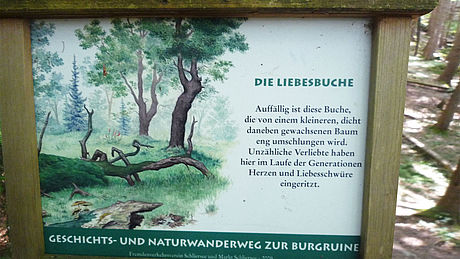 Entlang des Baumerlebniswegs finden Sie insgesamt 19 Tafeln. Diese erzählen Ihnen etwas über die Bäume und Sträucher nahe des Ufers. Unterwegs sehen Sie z.B. eine 100-jährige Rotbuche. In früheren Zeiten, als es noch keine Wetternachrichten gab, schlugen die Einheimischen Anfang November eine Kerbe in den Stamm dieses Baumes. Blieb der Stamm trocken, dann bedeutete es, dass ein harter und strenger Winter folgen würde. Eine weitere besondere Geschichte ist die der Verlobungstanne. Eigentlich handelt es sich gar nicht um eine Tanne, sondern um eine Fichte. Der Sage nach hatten sich viele verliebte Paare unter diesem Baum verlobt. Sogar sibirische Bäume gibt es unterwegs zu sehen.