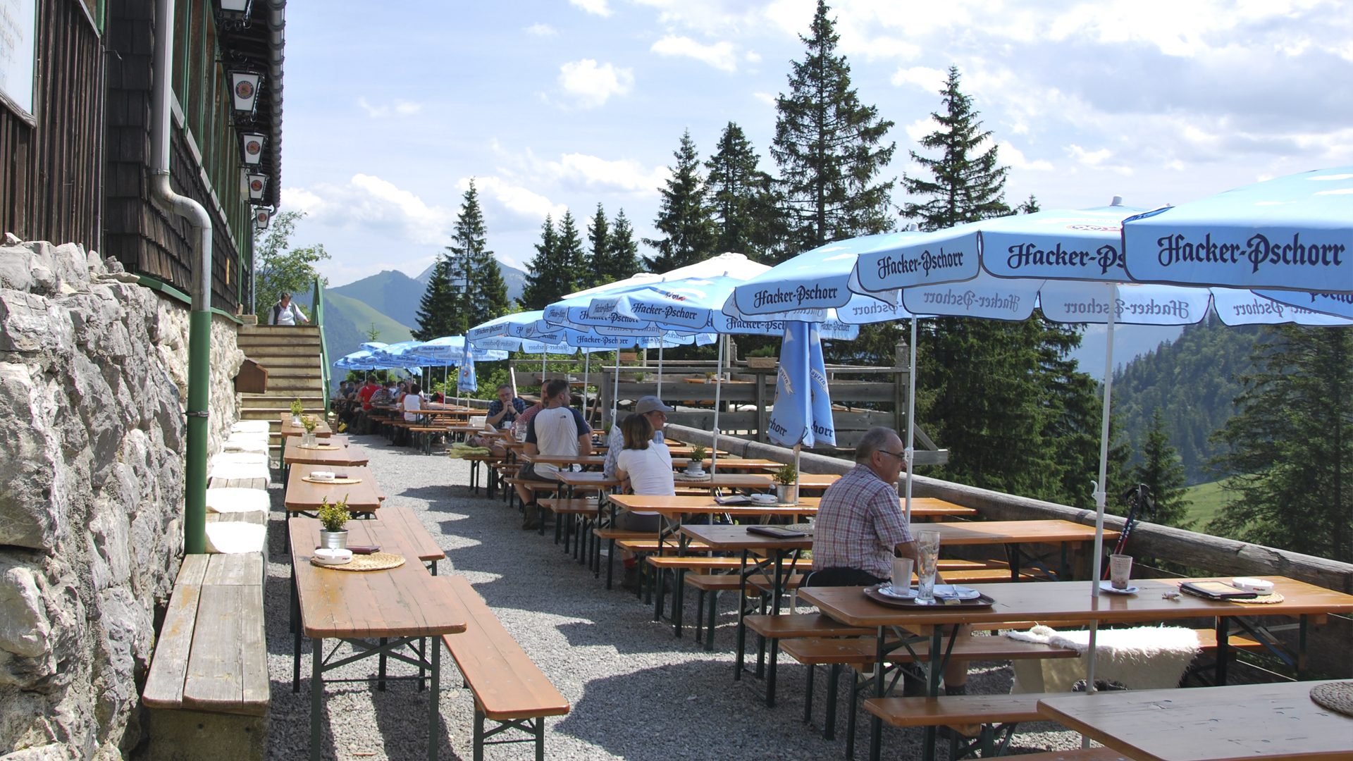 Direkt an der Bergstation lädt auch die urige Jagahütt´n mit großer Sonnenterrasse zur Einkehr ein.