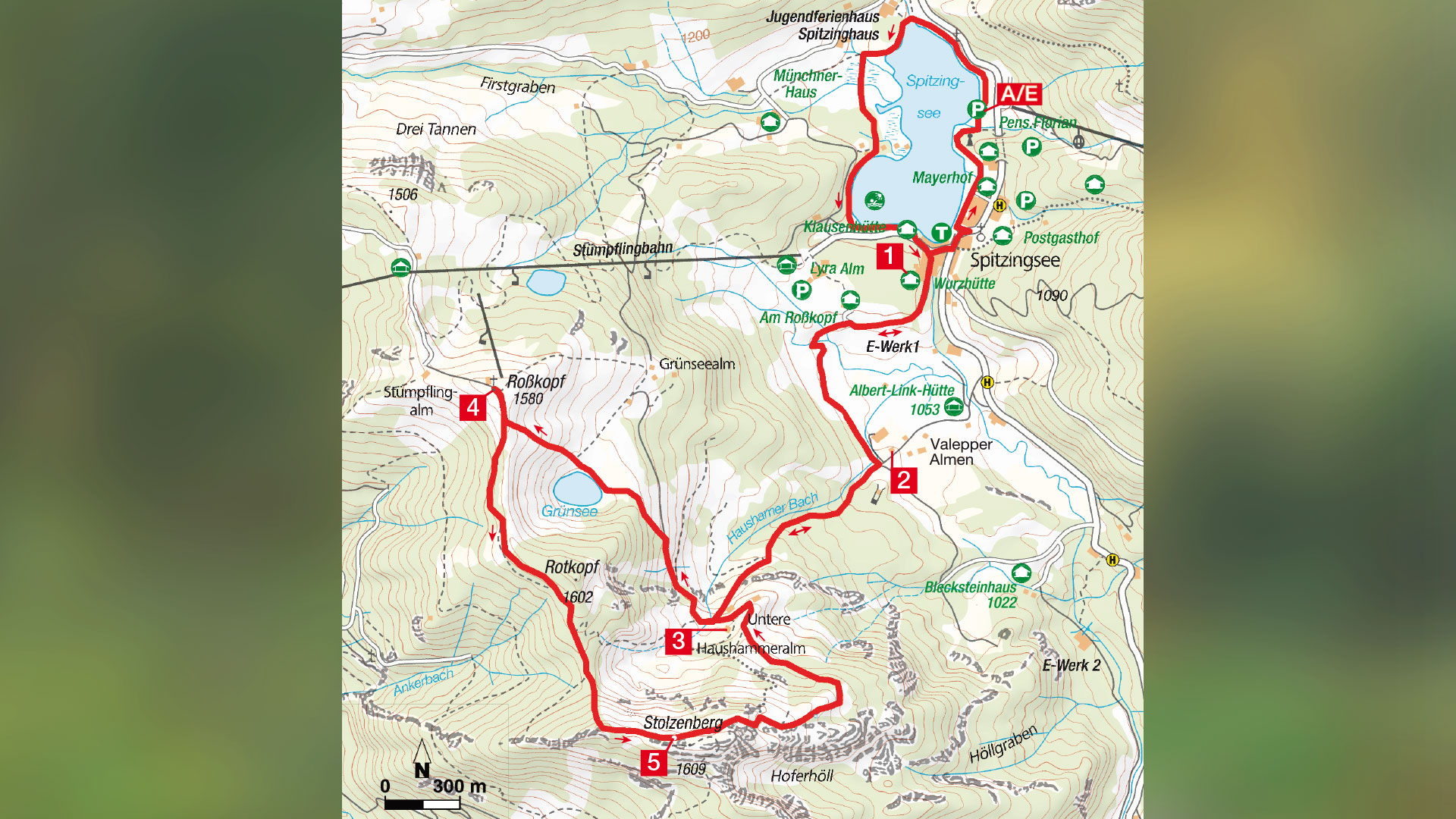 Der E.ON Bayern Trail am Spitzingsee beginnt an der Seepromenade in der Valepperstraße. Laufen Sie nun in Richtung Forsthaus und folgen Sie der Beschilderung nach Valepp. Der Weg verläuft an der Albert-Link-Hütte und weiter am Ufer der Roten Valepp flussabwärts. Sobald Sie die Brücke erreicht haben, biegen Sie nach rechts ab und laufen Sie zum Blecksteinhaus. Dort angekommen gönnen Sie sich erst einmal eine kleine Pause und starten dann den Weg zurück. Wandern Sie nun über die Valepper Almwiesen den Berg hinauf. Laufen Sie auf dem Rosskopfweg und genießen Sie den Ausblick auf das Sonnwendjoch. Bei der Klausenhütte geht es nach links auf den Seeweg. Jetzt führt Sie der E.ON Bayern Trail einmal um den Spitzingsee zurück zur Seepromenade und damit zum Ausgangspunkt der Nordic Walking Tour.