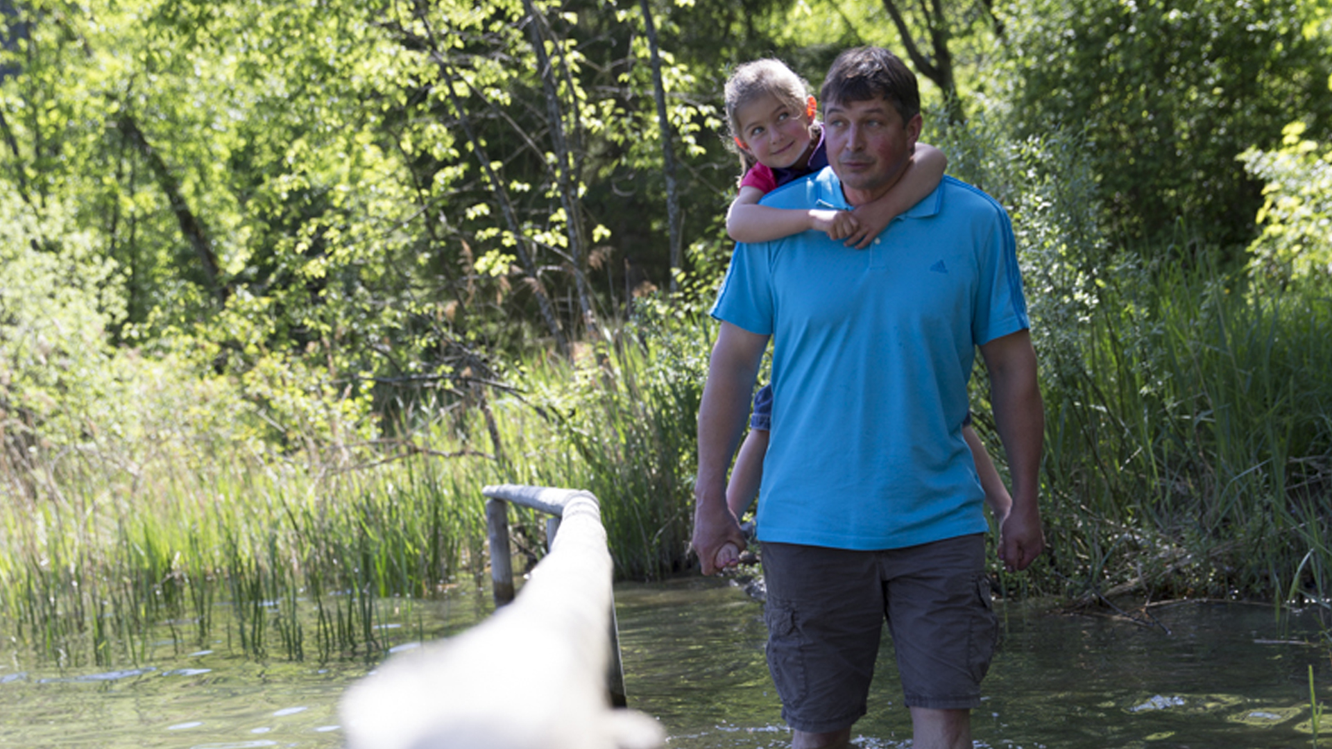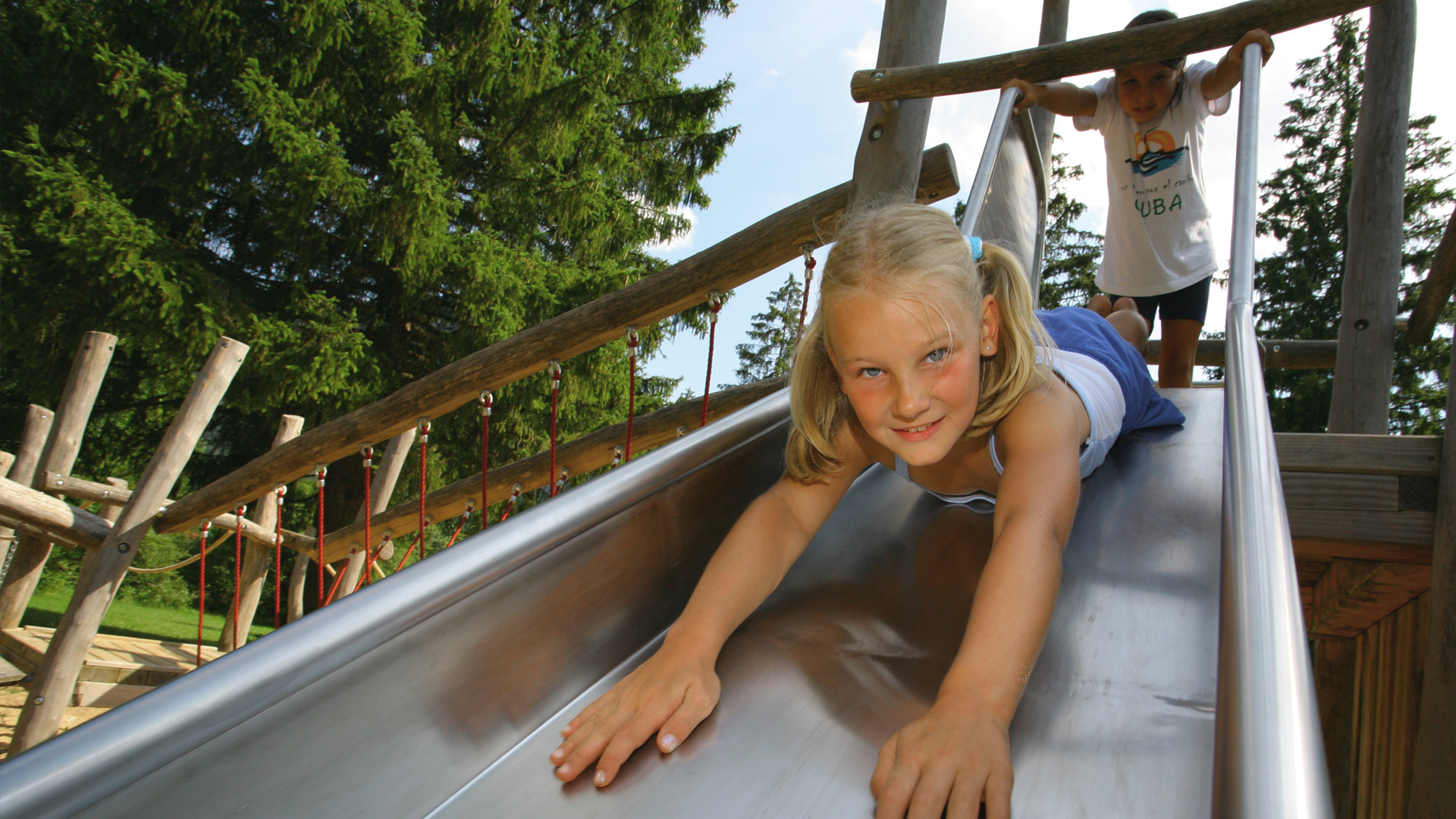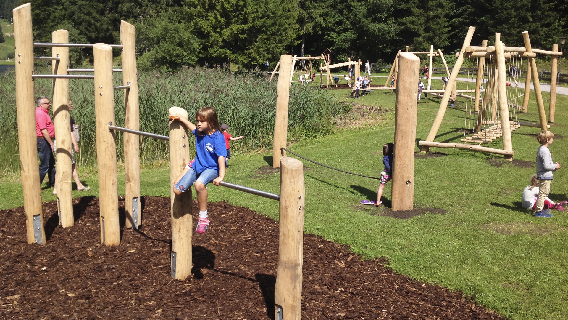 Für die Kinder stehen ein Karussell, Wippen mit Balancierelementen, ein Wackelsteg, Reckstangen und Tampenschwinger bereit. Körperspannung und das Gleichgewicht trainieren sie im Spiel auf der Slackline, der Balancierslackline und der Balancierbrücke.