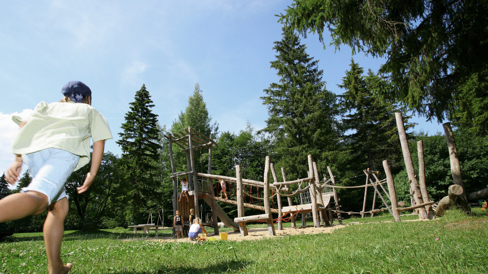Der Spielplatz am Kurpark bietet Kindern eine Vielzahl an Spielmöglichkeiten. Neben verschiedenen Schaukeln gibt es eine Wasserspielanlage, eine 24 Meter lange Seilbahn, eine Drehscheibe, Tampenschwinger, einen Drehbandlbaum, einen Stelzenparkour und einen Multifunktionsspieleturm. Fast alle Spielgeräte sind aus Holz. Kleinkinder können auf der Kleinkinderanlage im Sandkasten spielen und kleine Sandburgen bauen. Sehr viel Spaß bereitet sowohl großen als auch kleinen Kindern das Toben in der Matscheanlage und im Bach. Damit die Kinder nach dem Spielen nicht frieren, nehmen Sie am besten noch Bekleidung zum Wechseln, Badebekleidung, ein Handtuch und eine Decke mit.