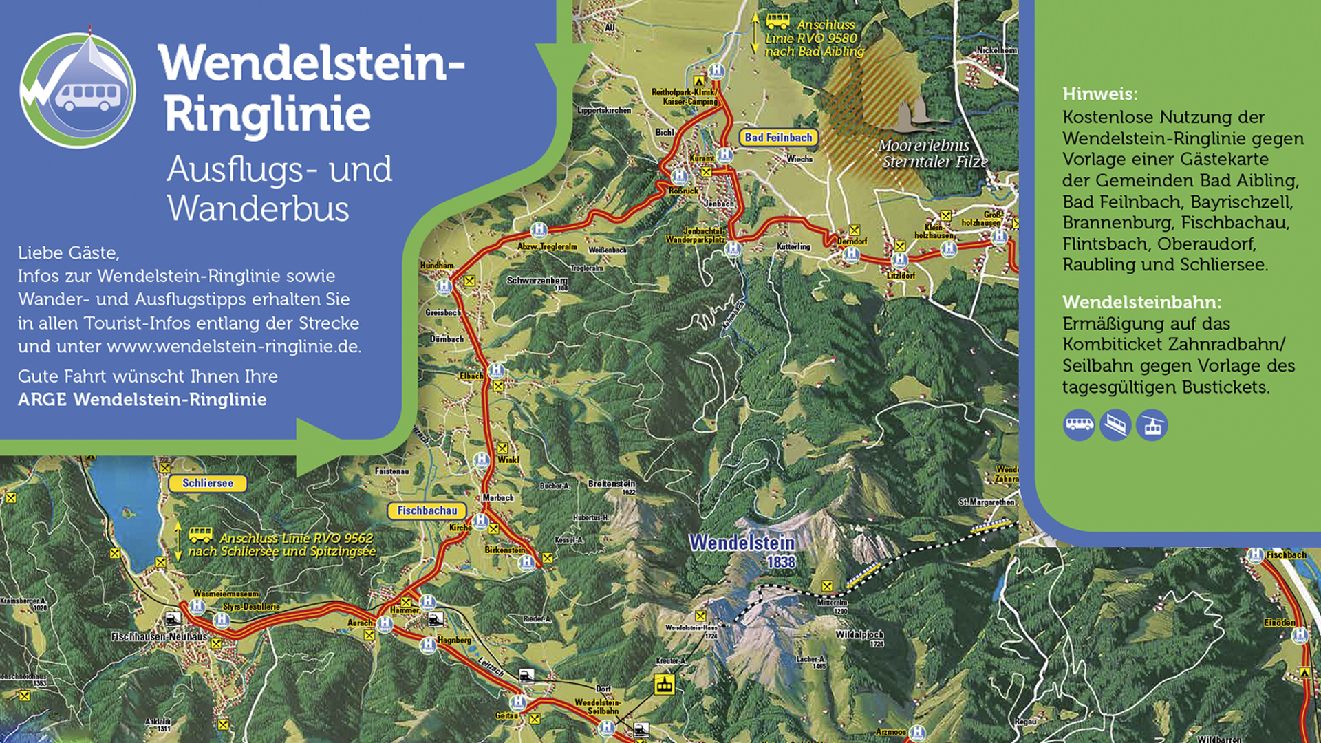 Für alle Inhaber der Schlierseer Gästekarte ist die Busfahrt mit der Wendelstein-Ringlinie kostenlos. Suchen Sie noch einige Tourenvorschläge für Wanderungen und Besichtigungen rund um den Schliersee und die Region? Entlang der Wendelstein-Ringlinie stehen die Broschüren in den Touristinfos für Sie kostenlos bereit.